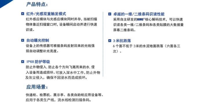 采用自主研發(fā)的UIMG核心解碼技術(shù),可快速識讀各類一維/二維條碼和各類貼膜的大數(shù)據(jù)量屏幕二維條碼。
